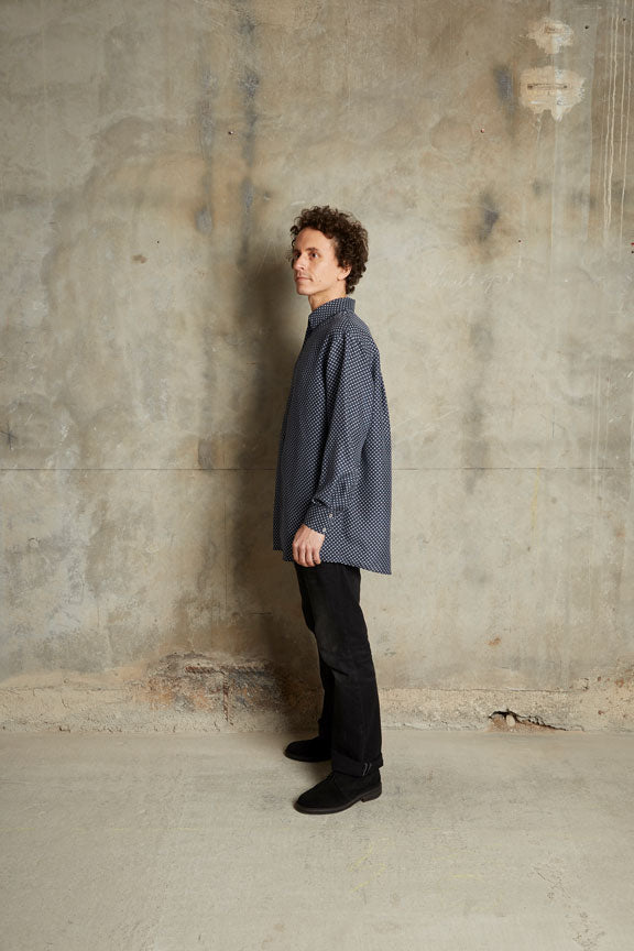 Dunkelblaues Hemd mit geometrischem Blumenprint in weiß aus italienischer Seide. Mit Kragen, Knopfleiste, Perlmuttknöpfen und einer doppellagigen Passe mit zwei seitlichen Falten im Rücken. Überschnittene Schultern, lange Ärmel mit geknöpften Manschetten und ein abgerundeter Saum mit etwas längerem Rückenteil. Der Stoff ist sandwash-veredelt, das verleiht der Seide einen matten Glanz.